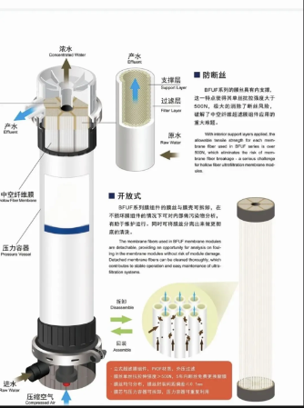 Tip de presiune internă: apa brută curge din interiorul membranei spre exterior, potrivită pentru calitatea apei cu turbiditate ridicată
